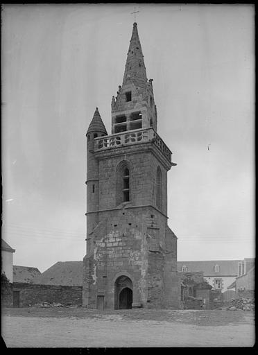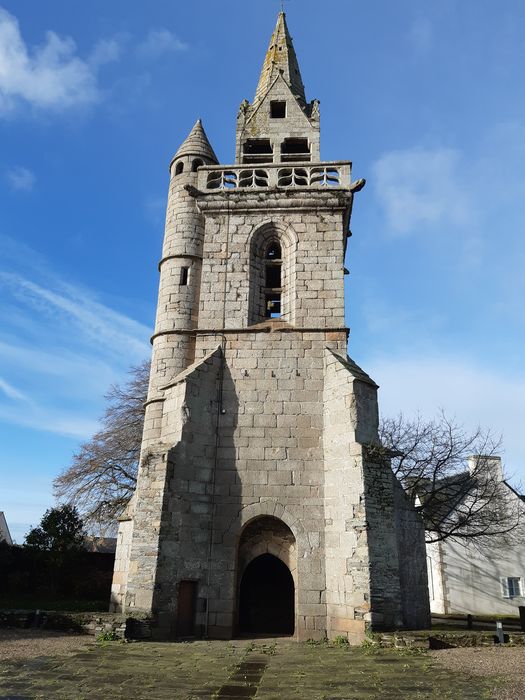 L'ancienne église a été remplacée par une nouvelle église. Du 15e siècle ne subsiste que le clocher. La tour carrée se termine par un étage percé de quatre baies que couronne une balustrade portée en encorbellement. Au-dessus, s'élève en retrait le campanile dont les cloches prennent appui sur trois piles parallèles de granit. Ces piles se terminent par des pignons donnant naissance à une flèche octogonale.