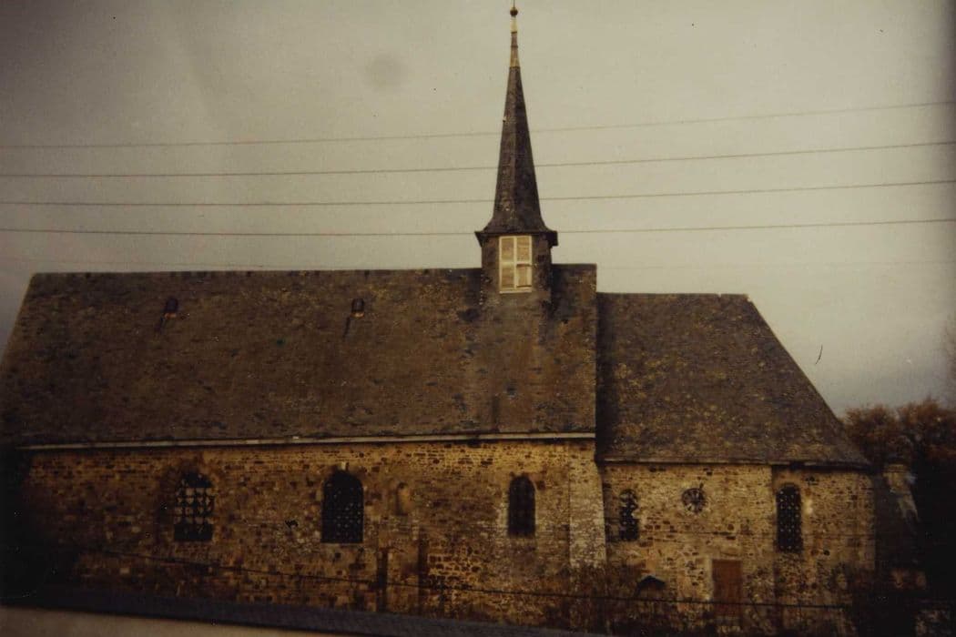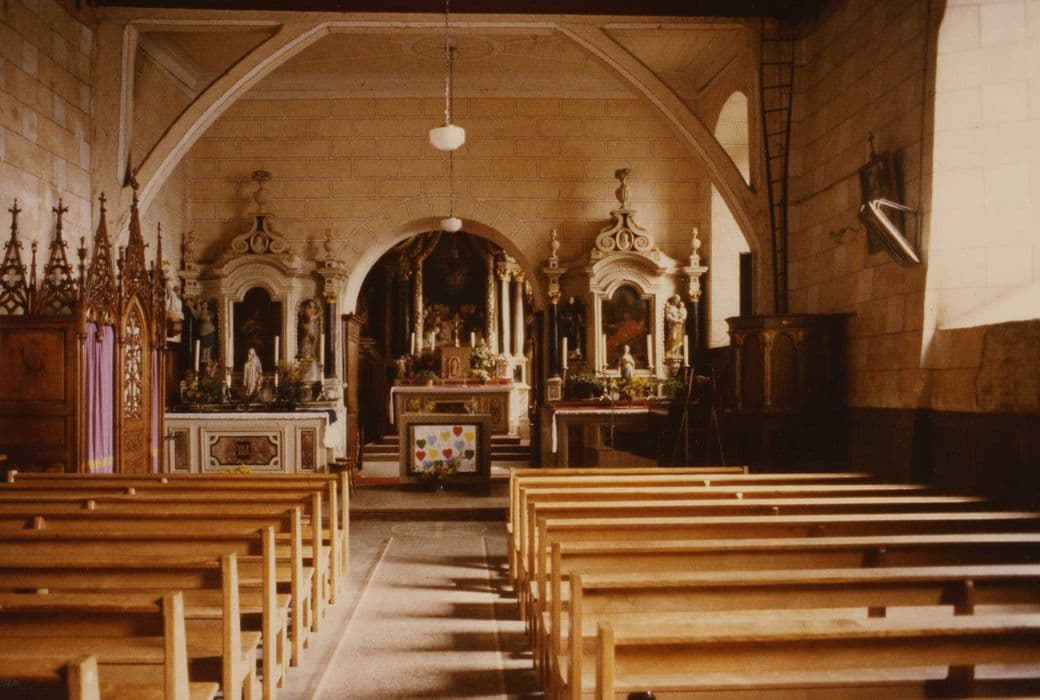 Eglise paroissiale dès la fin du 9e siècle, elle fut donnée comme prieuré à la fin du 11e siècle à l'abbaye de la Roë dans le Bas-Maine, par Robert d'Arbrissel, le célèbre fondateur de Fontevrault. Elle se compose d'une simple nef suivie d'un choeur plus étroit et profond qui comprend une partie droite terminée en hémicycle. A l'entrée du sanctuaire s'ouvre un arc triomphal percé dans un grand mur-diaphragme. On observe deux types de contreforts : les uns classiques, plats, minces, montant jusqu'au sommet du mur ; les autres (comme ceux de la façade) , énormes massifs de maçonnerie. L'appareil, formé d'un matériau de grès jaunâtre dans l'ensemble, présente des parties de blocage en petits moellons irréguliers et d'autres en moyen appareil régulier. Les différents type de contreforts et d'appareils ainsi que des reprises de maçonnerie nous permettent de déceler dans cet édifice d'origine romane plusieurs campagnes de construction.