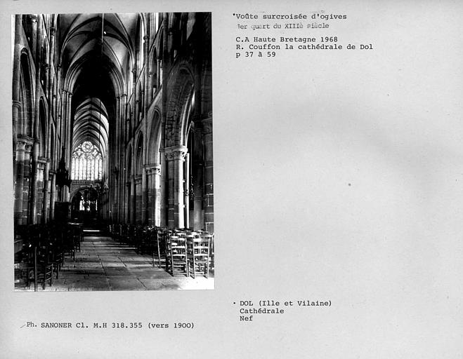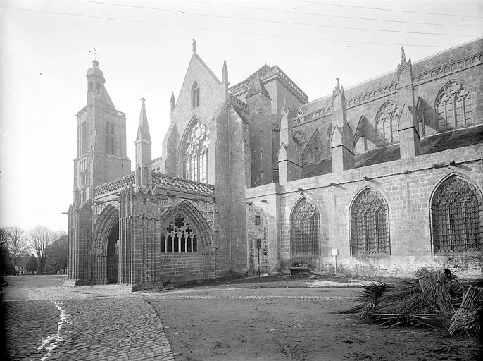 La cathédrale de Dol, fondée au 9e siècle, fut brûlée en 1203 par les troupes de Jean Sans Terre. L'édifice actuel, qui dut être commencé peu après, est un beau spécimen d'architecture gothique d'influence normande. La reconstruction débuta par la nef, continuée par le transept et terminée vers 1265 par le choeur. Une importante campagne de travaux au 14e siècle voit la construction de la tour de croisée, du grand porche sud, de la salle capitulaire et de la chapelle à pans coupés élevée à l'est du choeur. Du 15e siècle datent les deux étages supérieurs de la tour sud, et des modifications du porche sud. La tour nord, mise en chantier en 1520, ne fut jamais achevée, et la façade occidentale a été remaniée aux 16e et 17e siècles.