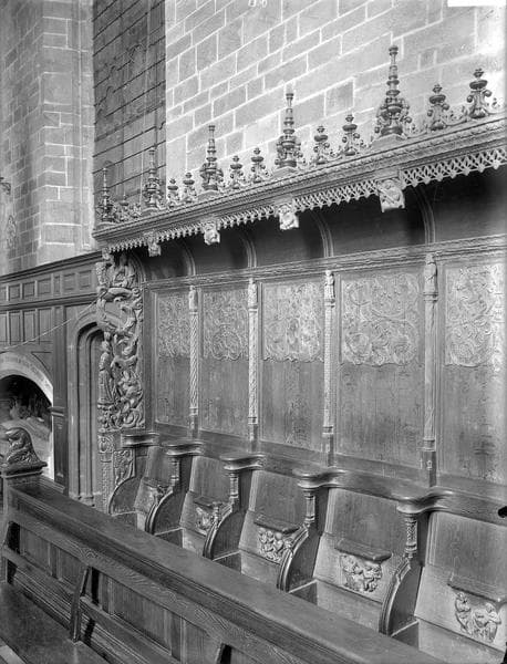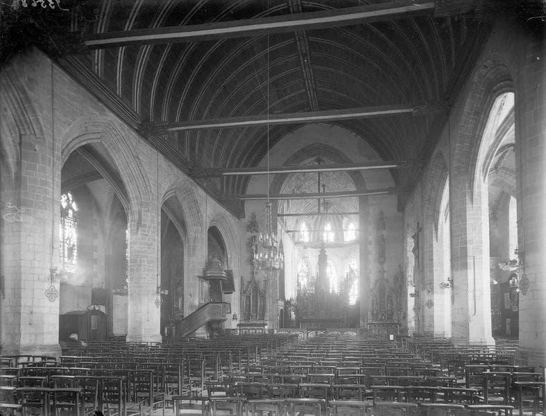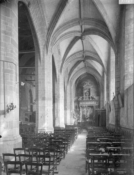 De la construction du 13e siècle ne subsiste qu'une partie de l'abside. L'édifice a été reconstruit aux 15e et 16e siècle. En 1556, l'église est pillée par les soldats de Rohan. Après les guerres de Religion, les chanoines font restaurer l'édifice et construire des stalles aux panneaux tous différents, représentant des scènes de l'Ecriture. Au nord, les miséricordes figurent les péchés capitaux. L'ornementation reprend les arabesques de style Renaissance.