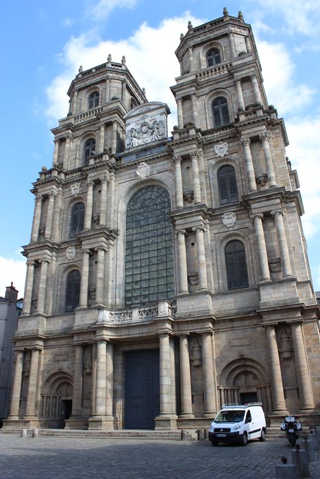 La cathédrale est le fruit de quatre campagnes de construction. De la première, en 1540, ne subsistent que les portails latéraux. Les colonnes qui les encadrent ne sont mises en place qu'au cours de la deuxième, entre 1611 et 1622. Au cours de la troisième, de 1640 à 1700 environ, la façade est achevée sous la direction des architectes lavallois Tugdual Caris, Pierre Corbineau et François Huguet. Le reste de la cathédrale, démoli en 1768, est reconstruit à partir de la fin du 18e siècle ; les travaux seront achevés en 1841, et le décor intérieur refait à partir de 1867.