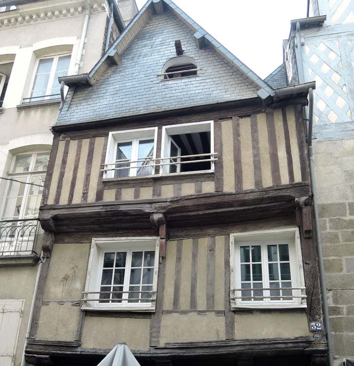 Petite maison présentant une toiture en pignon sur rue. L'avant-solier du rez-de-chaussée reste fléchi. La silhouette et les étages en encorbellement très prononcé lui donnent un caractère moyennageux.