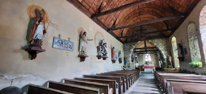 Eglise de la fin du 15e et du début du 16e siècle, composée d'une nef voûtée en bois en forme de carène renversée avec poinçons et entraits décorés de gueules de monstres à leurs extrémités. Le sanctuaire, également voûté en bois, présente des entraits non décorés. Entre la nef et le sanctuaire, un arc brisé soutient un pignon faisant saillie hors des toitures et terminé par un clocher mur pour deux cloches, ce qui semble indiquer que la nef constituait autrefois à elle seule toute l'église, et que le sanctuaire a été ajouté au 16e siècle. Vitraux du 16e siècle.