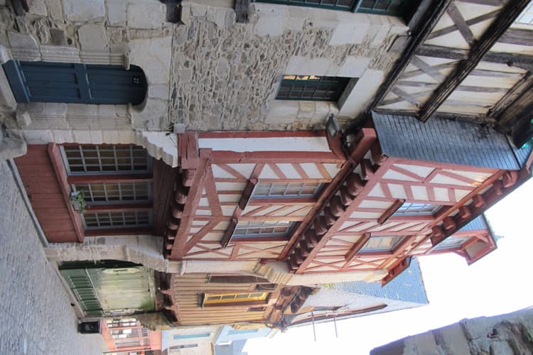 Maison avec pan de bois apparent et colonnettes garnies d'écailles.