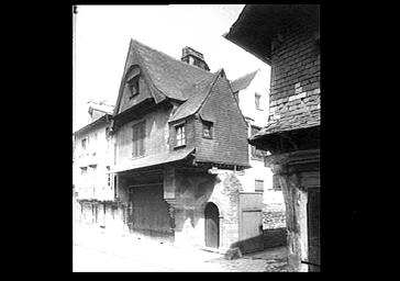 Maison datée de 1602, présentant un rez-de-chaussée en maçonnerie, un étage en pan de bois monté sur poutres moulurées, et des pignons couverts d'ardoises.