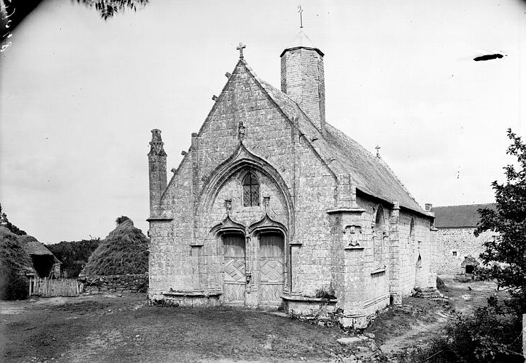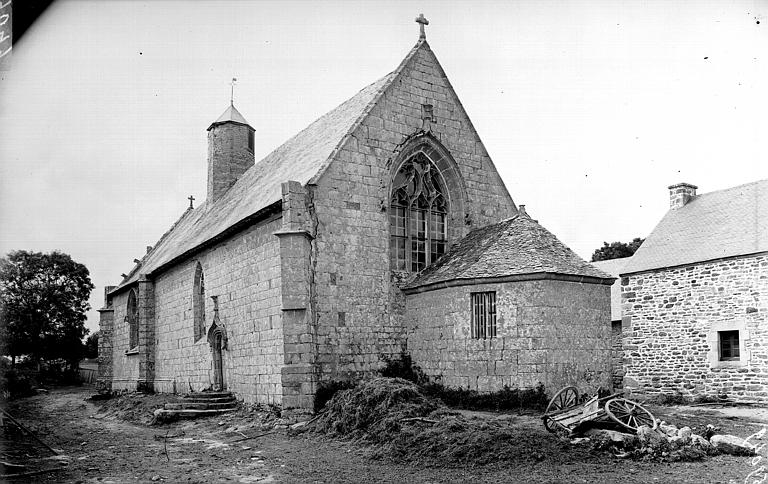 Une première étape de construction de l'édifice s'achève en 1488, comme en témoigne l'inscription sculptée sur une sablière. De plan rectangulaire allongé, elle conserve de cette époque toute la partie orientale avec sa fenêtre de chevet de style flamboyant, et, au sud, une porte en anse de panier dont l'accolade s'appuie sur des culots sculptés. Le reste de l'édifice date d'une phase de reconstruction au 16e siècle. Sa façade occidentale est ornée d'un portail qui enveloppe, dans un grand arc brisé à retraites, deux portes géminées en anse de panier dont les accolades s'appliquent sur le tympan.