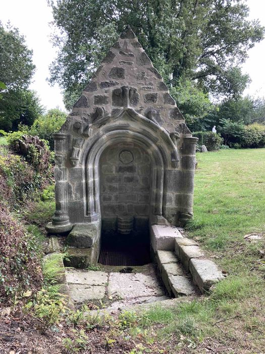 Autour de cette fontaine se tenait le "Pardon aux chevaux" qui attirait les cultivateurs de la région. L'ouvrage présente une niche en anse de panier dans un massif de maçonnerie sur plan rectangulaire. En façade, colonnes sur l'angle, sans amortissement. Accolade d'accompagnement avec éléments gothique ou Renaissance. Dans le fond, une autre petite niche est surmontée d'une coquille. Cul de lampe à ornementation Renaissance supportant une statue en bois. La descente à la piscine s'effectue par le côté avant. La vieille chapelle voisine a été démolie et certains éléments remployés. Il en reste une gargouille juchée sur un dais du 16e siècle.
