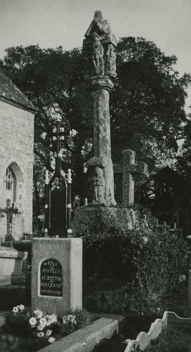 Grand fût octogonal avec statuette de Saint-Jean-Baptiste pris dans la masse inférieure. Christ en croix accompagné de Saint-Jean et de la Vierge, surmonté d'un fronton rectiligne assez aigu. Au verso, représentation de la Vierge.