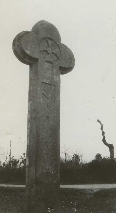 Croix de schiste composée d'un fût méplat avec arêtes moulurées en gorge. La tête et les bras affectent la forme d'un trèfle. Au recto, croix pattée en relief sur un disque refouillé à l'intersection des bras. En-dessous, forme d'écusson refouillé avec représentation d'un couteau de boucher et du fusil à aiguiser. Au verso, croix pattée gravée avec tige à la partie basse.