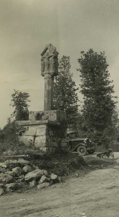 Croix sur gros fût octogonal reposant sur un socle en forme d'autel. Le Christ en croix d'un côté, la Vierge à l'Enfant de l'autre, sont accompagnés de deux personnages sur les angles. Les sujets sont surmontés d'un fronton rectiligne.