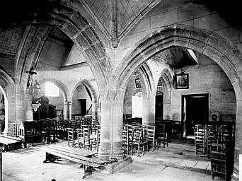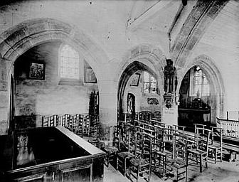 Edifice en forme de croix latine, fortement remanié au cours des siècles. Le transept a été doublé d'épaisseur. Une sacristie moderne a été ajoutée contre le choeur. La nef est flanquée de bas-côtés séparés de la nef par des arcades reposant sur des piliers cylindriques octogonaux. Choeur polygonal. Fragments de vitraux du 16e siècle représentant une Annonciation, et une Vierge au pied de la croix en compagnie de Saint-Jean et de Saint-Pierre. Le pignon de la nef est percé d'une porte géminée en anse de panier, surmontée d'accolades très décorées de fleurons et de crochets. £