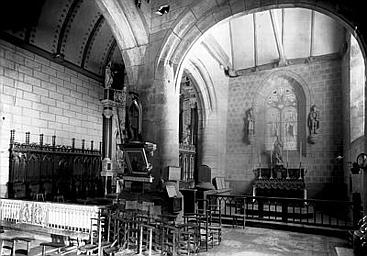 L'ensemble de l'édifice, de plan en croix latine, semble remonter au 11e siècle. Les murs sont en blocage de schiste et de granit mélangés. Les contreforts semblent avoir été rapportés postérieurement. Le plan comportait une nef sans collatéraux, éclairée par de petites fenêtres en plein cintre, largement ébrasées. Le transept à deux croisillons flanqué à l'angle nord-est d'une tourelle contenant l'escalier de la tour qui surmontait la croisée, a vu ses quatre arcs plein cintre remplacés, à l'époque gothique, par des arcs aigus. Les chapiteaux à crochets et les bases à socles surélevés, moulurés de tores plus ou moins aplatis, dénotent la fin du 13e ou le début du 14e siècle. Choeur et façades du croisillon sud remaniés au 16e siècle avec adjonction d'une chapelle au sud du choeur.