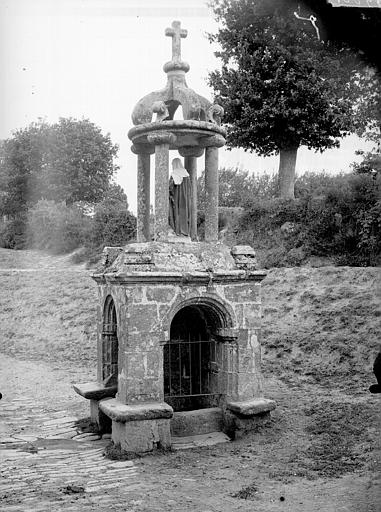 Edicule en pierre avec baies moulurées et bancs. Les quatre colonnes et le dôme en arcades qui surmontent la fontaine sont de date plus récente.