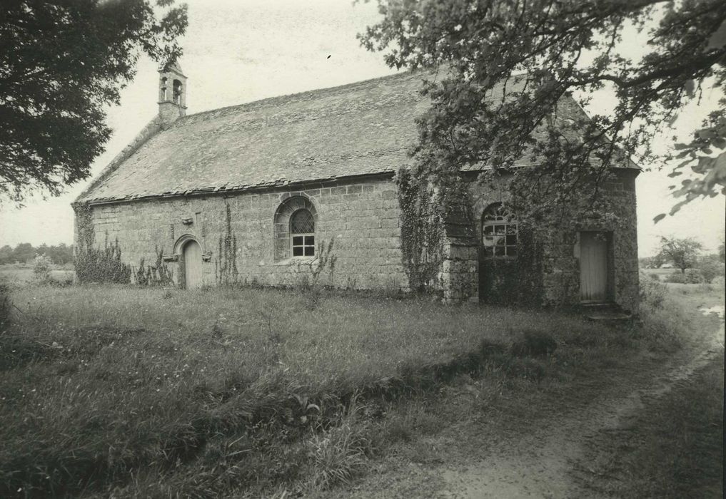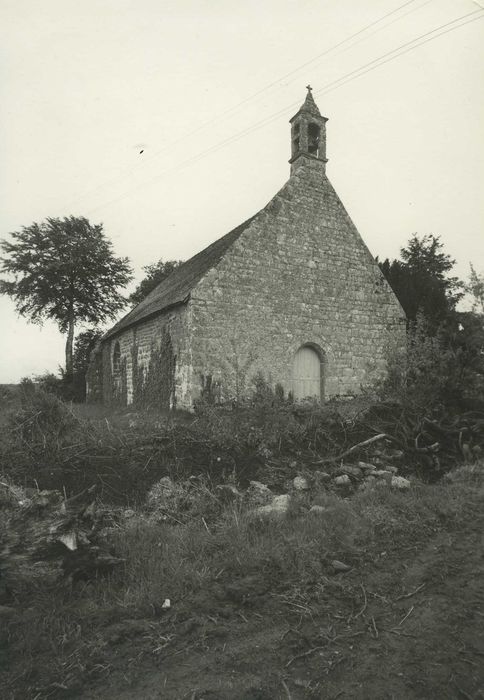 La chapelle est un édifice de caractère rural, de plan rectangulaire et sacristie polygonale ajoutée à une date ultérieure. Nef unique rectangulaire. La façade sud est percée d'une porte en plein cintre accostée des deux côtés, à mi hauteur, de deux impostes avec animal sculpté au-dessus pour l'une, et d'une tête d'homme et monstre pour l'autre. L'ensemble du socle et de la croix semble daté de la même époque que la chapelle. L'ensemble repose sur un escalier de granit à trois degrés. Socle de section rectangulaire. Fût de la croix, croix et Christ monolithes. Le Christ est sculpté en bas-relief et présente une tête aux traits en méplat.