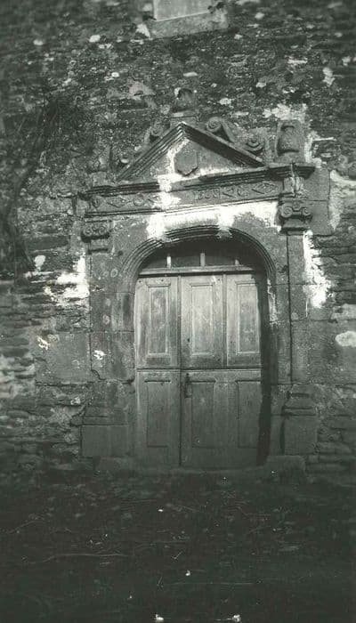 La maison s'ouvre par une porte en granit, en anse de panier, encadrée de pilastres Renaissance. Chapiteaux à volutes, entablement, frise avec losanges, fronton avec mouvement de crochets traités en spirales.