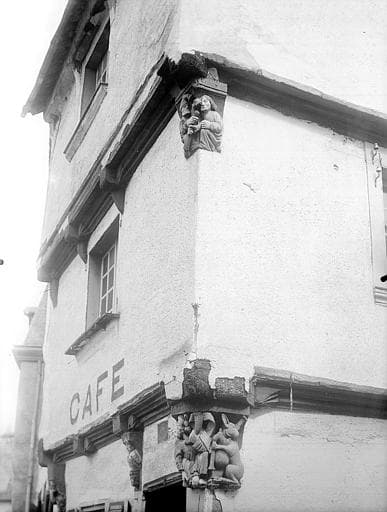 Maison à pans de bois ornée de sculptures sur bois représentant des grotesques.