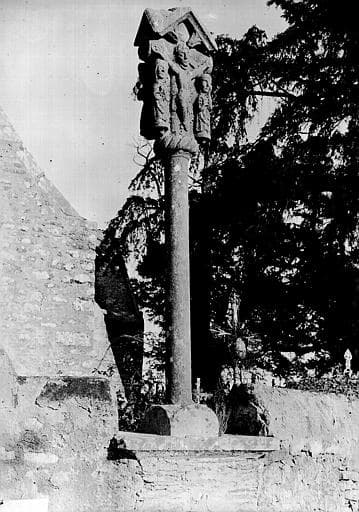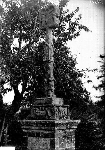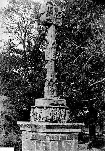Croix de cimetière en granit, quadrangulaire, avec une crucifixion entre la Vierge et Saint-Jean et, au revers, Jésus dans sa gloire au milieu des symboles des Evangélistes. Le fût hexagonal se termine par quatre niches à pignons traingulaires contenant Saint-Jean-Baptiste, Saint-Jacques le Majeur, Saint-Pierre et Saint-Paul, Saint-Michel, Saint-Jacques de Compostelle. Vers son milieu, autres niches à pignons contenant les trois Evangélistes et le lion de Saint-Marc.