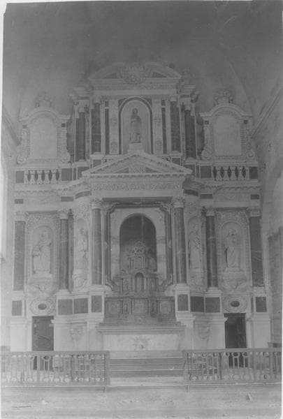 Dans le choeur de l'ancienne chapelle, retable en pierre sculptée et plaquage de marbre noir, avec statues, et retable en bois doré avec statuettes sur l'autel.
