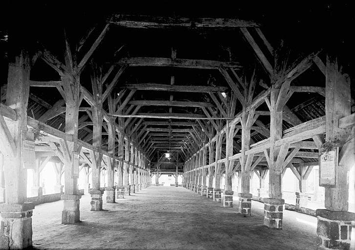 Halles en charpente de chêne datant de 1675, construites sur un plan rectangulaire et mesurant 56m de long sur 15, 50m de large. Elles se composent d'une grande nef de 17 travées, appuyée par deux parties constituant bas-côtés. Tous les poteaux des fermes reposent sur des piedestaux en granit. Ceux en bordure de l'extérieur sont reliés par un muret percé irrégulièrement de passages correspondants aux rues débouchant sur la place.