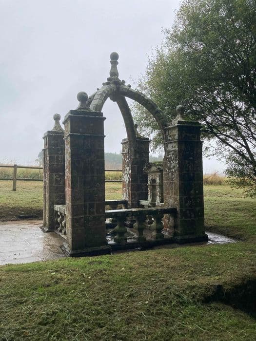 Fontaine de plan carré avec quatre piliers aux angles reliés entre eux par des arceaux de granit. Disposés en diagonale au-dessus de la source. Une balustrade en granit joint ces piliers.