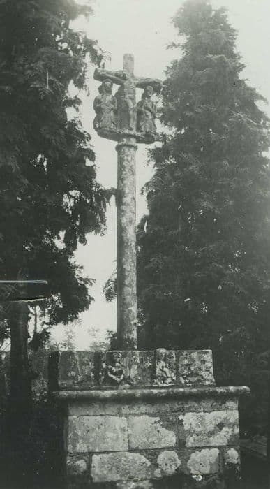 Socle autel avec pierre de retable avec buste de la Vierge et de l'ange. Grand fût en granit supportant le Christ et les deux personnages habituels se silhouettant.
