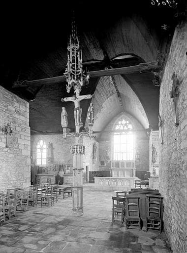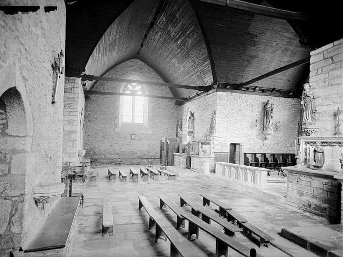 Petite chapelle du 15e siècle (date de 1494 sur les sablières) , élevée à la suite d'un voeu ou pour commémorer un fait qui, par la suite, est devenue lieu de pélerinage. Elle comprend encore son enclos, son calvaire et sa fontaine. Sur plan en croix latine, elle est bâtie en pierre de taille aux pignons, le reste étant en moëllons. Le pignon ouest est le plus ouvragé, avec mouluration encadrant la porte ogivale en saillie. Une flèche très allongée se trouve au centre de la nef. La fenêtre du chevet est flamboyante et contient quelques restes de vitraux. Les sablières de la nef et du choeur présentent, en plus de caractères gothiques, des personnages et des feuillages.