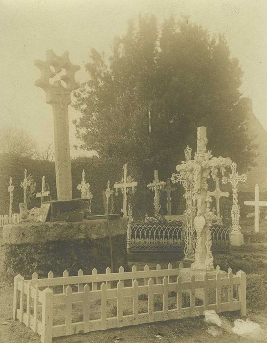 Croix de cimetière présentant quatre feuilles ajourées à lobes légèrement allongés. L'axe de ce motif est disposé en x. L'extrémité des bras de la croix, ainsi que l'intervalle entre eux, se profile par un demi cercle rentrant, donnant à l'ensemble l'aspect d'une sorte de roue dentée. Le raccordement entre la croix et le fût est orné d'un petit Christ de peu de saillie. Fût octogonal applati. La base est cubique et repose sur un massif circulaire. Les tombes de l'église remontant à 1545 peuvent faire supposer que ce calvaire appartient à cette époque.