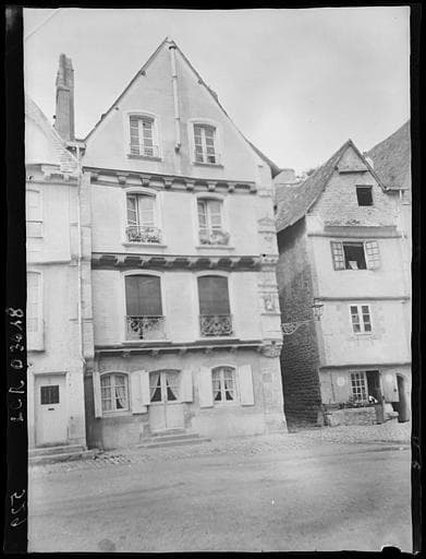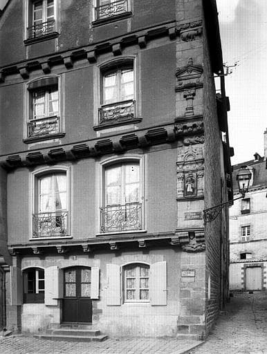 Immeuble en pierre et bois dont la façade principale comporte un rez-de-chaussée, deux étages en encorbellement léger et un troisième en encorbellement situé dans le pignon. Deux fenêtres par étage. Baies à frontons légèrement arrondis. Balcons de fer forgé aux étages. Les poutres d'encorbellement sont soutenues par des corbeaux sculptés, sauf au dernier étage. La curiosité de cette maison réside surtout dans la bande de pierre sculptée qui s'étend sur toute la hauteur de la façade. On y voit des motifs de style Renaissance s'alignant sur les divisions des encorbellements et, entre les étages, une niche très ornée avec une statue de Saint-Yves au premier ; un pilastre à fronton triangulaire très orné au second ; une mouluration au troisième.
