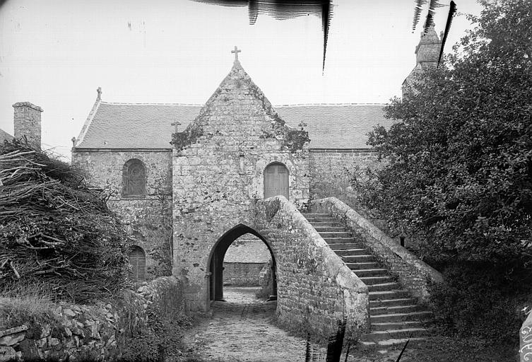 Chapelle située au premier étage, dont l'accès s'effectue par les façades latérales au moyen de perrons contournés à marches de granit. Correspondant à une espèce de transept de la chapelle, un arc en ogive placé dans l'axe de ce transept, donne point de départ à une voûte, fermant un passage de voiture existant sous la chapelle, ayant à droite une excavation dans laquelle a été figurée une grotte de Lourdes et, à gauche, une petite chapelle au niveau de rez-de-chaussée. Les deux pignons du transept sont couronnés au départ et au sommet de croix de granit. Un petit clocher en granit se situe à l'extrémité droite de la nef.