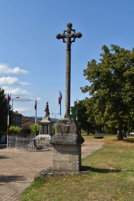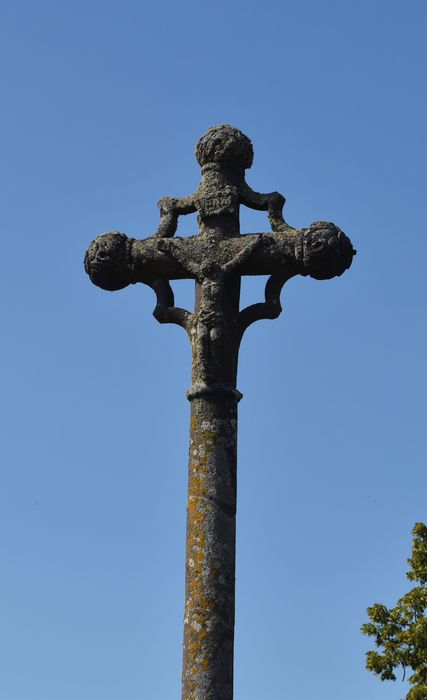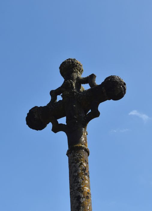 Cette croix du 16e siècle porte, d'un côté, le Christ ; de l'autre, la Vierge tenant l'Enfant. Les extrémités de la croix sont fleuronnées. Dans les angles, des accolades soutiennent les bras.