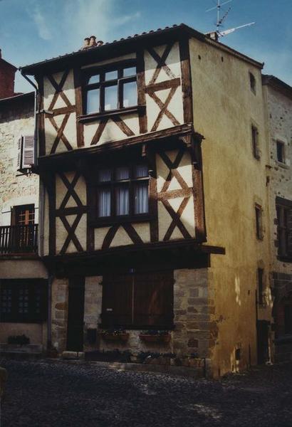 La façade sud de cette maison, qui s'ouvre au nord du chevet de l'église, possède deux étages en encorbellement, au-dessus d'un rez-de-chaussée comportant une porte et une grande baie modernes qui ont conservé leur linteau chanfreiné constitué d'une grosse poutre de bois. L'encorbellement du second étage est formé par une rangée de quatre consoles moulurées supportant une sablière horizontale moulurée. Chacun des deux étages comporte une fenêtre disposées dans le même axe et ayant conservé leur encadrement et leur appui saillant mouluré en bois. Les pans de bois sont recouverts d'un crépi.