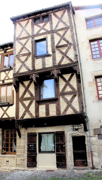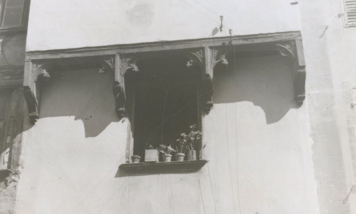 Au rez-de-chaussée de cette maison du 15e siècle, une petite porte s'ouvrant à l'extrémité sud possède un linteau en accolade mouluré d'un boudin. Cette moulure se poursuit le long des piédroits pour retomber sur des bases prismatiques. L'encorbellement du premier étage repose sur une poutre horizontale moulurée que soutiennent deux consoles. La fenêtre du premier étage a conservé son encadrement et son appui saillant mouluré, en bois. Au-dessus, l'encorbellement du second étage repose également sur une poutre horizontale moulurée que soutient une rangée de quatre consoles en bois sculptées. Un crépi masque l'ossature des pans de bois de la façade.