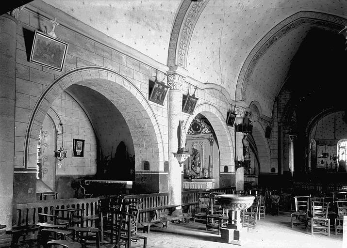 Au 12e siècle, l'église se composait d'un choeur carré avec abside circulaire, d'un transept avec, de chaque côté de ce choeur, une absidiole, et d'une nef. Une tour surmontait la croisée de transept. A différentes époques, ont été ajoutées latéralement à la nef des chapelles. La tour du clocher a pu être octogonale à sa partie haute, qui a été remaniée. Dans son état actuel, l'édifice a conservé son choeur, son transept et ses absidioles, les voûtes et les piliers intérieurs de la nef, quelques traces des anciennes fenêtres de la nef, ainsi que le portail sud qui doit remonter aux premières années du 13e siècle. L'aspect de ces parties anciennes diffère un peu des exemples connus dans la région, particulièrement la partie haute du transept.