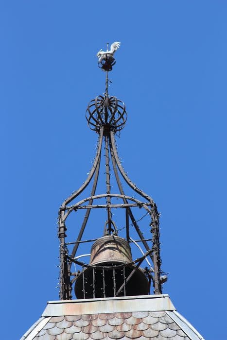 La commune était fortifiée en 1589. En 1686, ce lieu était encore entouré d'une enceinte de murs et de tours, protégée par des fossés. Rare vestige de ces fortifications qui ceinturaient la ville, cette ancienne porte sert aujourd'hui de beffroi. Elle a été transformée à l'époque classique (avant la fin du 17e siècle) et est surmontée d'un clocheton en fer forgé. Le tout, couronné par une sphère métallique, est surmonté par un paratonnerre.£La porte a été édifiée sur un plan rectangulaire. A l'est sont encore visibles les restes d'une tour ronde engagée. La porte elle-même est un passage voûté en plein cintre. Le côté nord est percé de fenêtres.