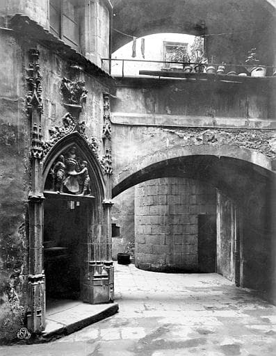 Dans la cour, belle porte aux armes des Savaron. Ponts superposés reliant les deux corps de bâtiment. Derrière le pont du premier étage, cul de lampe richement sculpté portant sur son assise du bas la date de 1513. Les clefs des croisées d'ogive portant les ponts sont sculptées, ajourées et timbrées à leur centre du chiffre de Hugues Savaron. Au rez-de-chaussée du bâtiment, bordant la rue, est une belle salle voûtée sur croisée d'ogive dont les clefs portent soit les armes des Savaron, soit le chiffre de Hugues Savaron.
