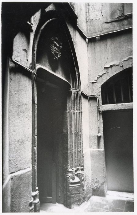 La tourelle d'escalier constitue l'unique élément intéressant de cet immeuble du 15e siècle ayant perdu tout caractère en façade et dans la cour intérieure. La tourelle ouvre par une porte à partir de bases prismatiques, les piédroits sont moulurés d'un cavet entre deux tores dont l'un plus gros chargé d'un filet. Deux cavets encadrent ce corps de moulures. L'arc brisé est de même mouluration. Le tympan, souligné par un linteau mouluré d'une baguette, est chargé d'un écu sculpté en relief d'armoiries, surmonté d'un cimier à l'abondant panache et entouré de deux palmes aux tiges croisées sous sa pointe.