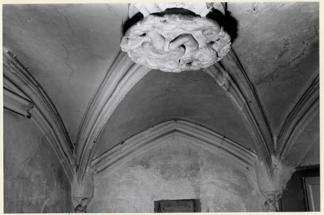 Cet oratoire est en fait une pièce en surplomb au-dessus d'une descente de cave. Cette pièce allongée est éclairée, du côté de l'accès de la cave, par une fenêtre guichet à chambranle chanfreiné et bassoir en saillie. La pièce est voûtée d'ogives à clef centrale pendante blasonnée avec une tour crénelée ouverte accompagnée de trois étoiles. Une crosse à volute est placée en pal derrière l'écu. Un ange porte cet écu qui est ceint d'une couronne extérieure à rinceaux et volute. Les quatre nervures de la croisée d'ogives retombent, ainsi que les arcs formerets brisés qui déchargent les murs, sur des culots empâtés soutenus par des anges sexués, variés dans leurs attitudes. Aucun document ne mentionne cet édifice qui peut être daté, par son style, de la période qui a suivi le grand tremblement de terre de 1490. L'identification en tant qu'oratoire n'est qu'une supposition, mais la crosse figurée sur la clef de voûte indique que le commanditaire en était soit un abbé, soit un évêque.