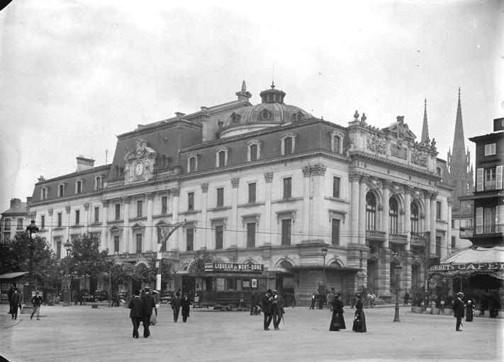 Dès 1850, il fut question de remplacer la vieille salle située au sud de la place de la Victoire par un théâtre plus vaste et plus digne de sa fonction. La décision est prise d'aménager le bâtiment de l'ancienne halle aux toiles, construit entre 1815 et 1820. Le projet est confié à l'architecte Jean-Joseph Teillard. Gourgouillon est chargé des sculptures et Jules Toulot des scènes peintes. L'inauguration eut lieu en 1894, mais la décoration du foyer ne fut réalisée qu'en 1901. £Teillard adpota le parti du théâtre à l'italienne : façade avec porche et loggia ouvrant sur un vaste vestibule surmonté du foyer ; salle à balcons en fer à cheval répartis en classes ; scène à l'italienne avec coulisses, dessous et cintres. Du vestibule partent plusieurs escaliers, chacun desservant un niveau différent.