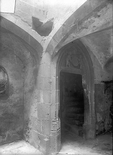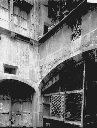 A droite, au fond du couloir de la maison, existe une porte d'escalier dans le tympan de laquelle se voit un écu penché porté par deux amours, timbré d'un casque de profil, ayant un ange en cimier. Cet écu porte une croix haute accostée en chef de deux étoiles, armes des Dumas de Paulard. Dans la cour existe une fenêtre à meneaux et croisillons aux moulures fines et bien taillées, ainsi qu'une galerie dont l'appui, au premier étage, porte, dans un ajour réservé en son centre, un Saint Christophe sculpté en ronde-bosse.