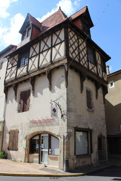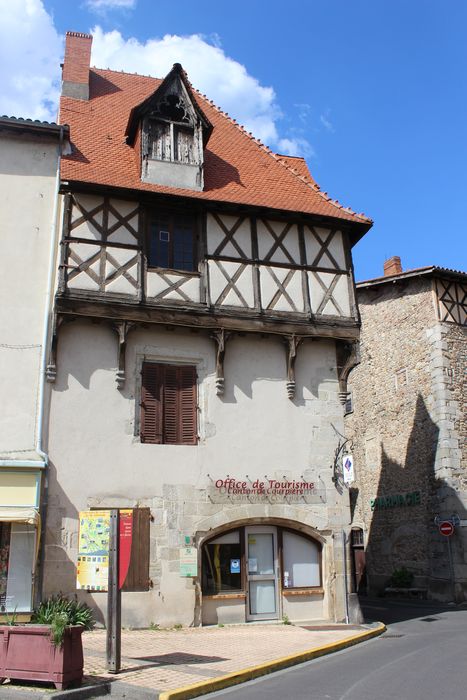 Maison ayant probablement été édifiée au 15e siècle par un marchand tenant boutique au rez-de-chaussée, comme en témoigne une arcade en anse de panier, moulurée et à bases prismatiques. La partie supérieure en pan de bois servait de séchoir, selon un modèle autrefois très répandu dans le Livradois. La sablière porte six travées délimitées par des poteaux de remplissages et garnies d'entretoises et de décharges en croix-de-Saint-André sur deux niveaux. En bâtière, au-dessus de la lucarne éclairant les combles, un fronton triangulaire ajouré est orné de festons polylobés aux pointes ornées de trèfles. Cette maison a conservé l'essentiel de ses percements d'origine et présente une disposition assez répandue autrefois à Courpière : deux niveaux maçonnés et un étage à pan de bois.