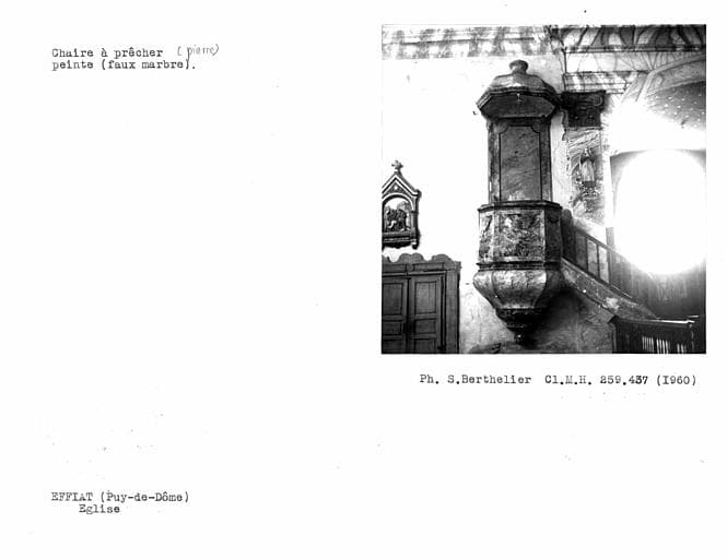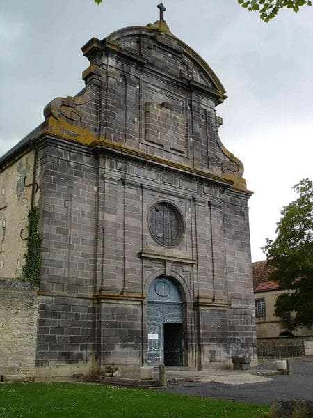 Eglise construite par le maréchal d'Effiat qui mourut en 1632 et s'y fit enterrer. Cette église était au départ la chapelle de l'école militaire du régiment d'Effiat fondé par le marquis. Une autre chapelle existait pour le château. En 1905, l'église est considérée comme église communale. C'est un édifice à nef unique comportant un transept et une abside en hémicycle. Le clocher se situe en hors-oeuvre sur le flanc oriental. De section carrée, il présente un toit en dôme surmonté d'un lanternon dans le style du 17e siècle. Toit très plat dans la tradition Auvergne-Midi. Ce monument est le seul édifice d'architecture religieuse de style classique du Puy-de-Dôme, avec l'église des Minimes de Clermont-Ferrand.