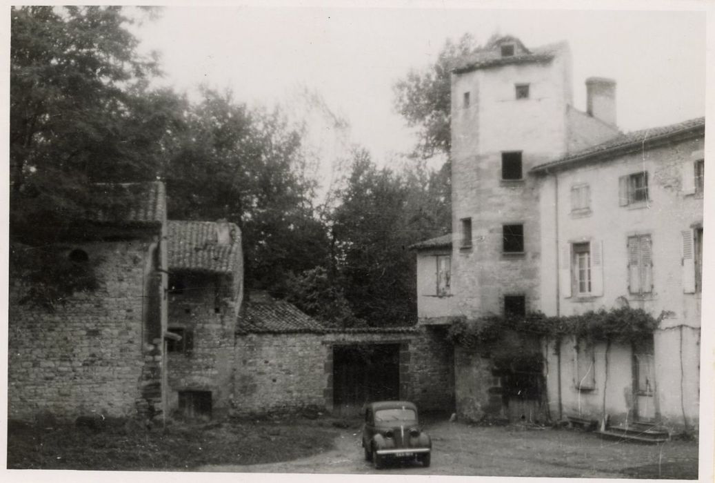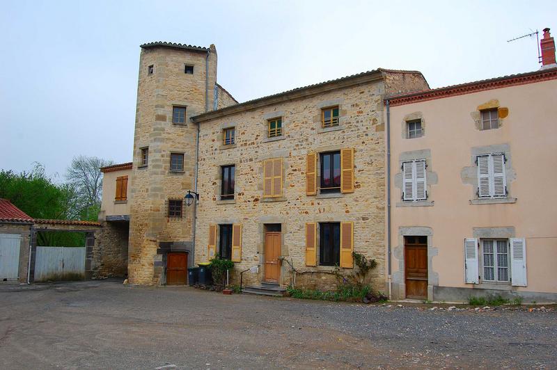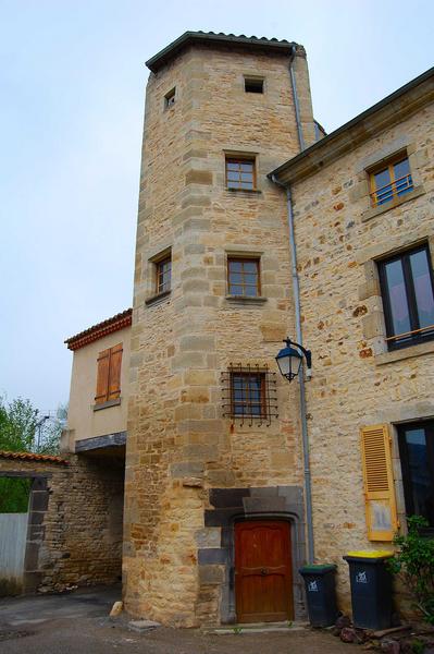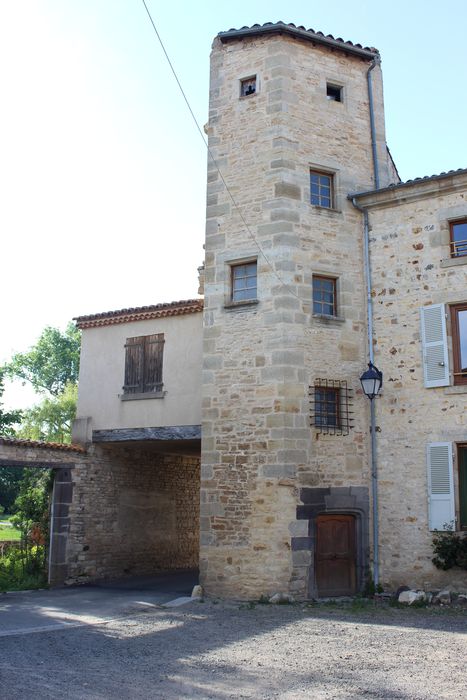Adossée à l'ancienne courtine se trouve une maison comportant une tourelle d'escalier polygonale du 15e siècle. Cette tour est située à l'emplacement de la porte ancienne fortifiée qui donnait accès à la forteresse, au côté nord-ouest. C'est une tourelle hexagonale à pans coupés, renfermant un escalier à vis. La face ouest est flanquée à hauteur du premier étage d'une petite construction soutenue par des poutres de bois, au-dessus d'un passage donnant accès à la place de l'Eglise. Ce passage était primitivement voûté en plein cintre ; cette voûte supportait une construction assez élevée qui a été démolie, dont il reste notamment les vestiges d'une cheminée Renaissance.