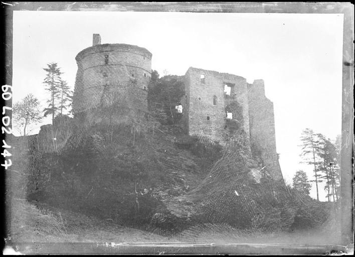 Les vestiges du château présentent une grosse tour cylindrique de seize mètres de diamètre constituant le donjon du 16e siècle ; des constructions disposées autour d'une cour centrale avec façades sur les diverses orientations opposées à celle du donjon. Le donjon se compose de deux étages sur caves. La partie haute présente une série de corbeaux disposés deux par deux, qui supportaient les échauguettes de la défense supérieure. A l'intérieur, les étages sont reliés par un escalier à vis. Chaque étage se compose de trois pièces avec grandes cheminées moulurées à courbes et contre courbes, menuiseries, fragments de l'ancien carrelage. L'enceinte renferme également les restes de la chapelle voûtée.