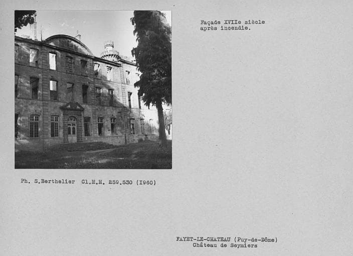 Le fief de Seymiers est qualifié de baronnie de 1584 à 1789. François-Gaspard de Montmorin fit réparer le château féodal et sans doute aménager au côté de ce dernier la construction d'ordonnance classique, pour y recevoir Louis XV en 1740. Le donjon fut remanié au 19e siècle en style "troubadour". Au pied de ce donjon du 15e siècle se trouve le château du 18e ruiné par un incendie en 1927. Il était formé d'un corps de logis rectangulaire prolongé par des pavillons aux extrémités. Le rez-de-chaussée s'ouvre par une porte qui s'ouvre sous un arc en plein cintre dont les pilastres doriques supportent l'entablement dont la corniche est surmontée d'un fronton interrompu vers le haut, contenant deux médaillons du lion rampant des Montmorin. A l'intérieur, restes de la rampe en fer forgé, de menuiserie, de décor stuqué. Sont également encore visibles, une cheminée gothique et une cheminée en faïence à décor de treillis. Une autre cheminée en faïence du 18e siècle a été remployée dans une salle du donjon.