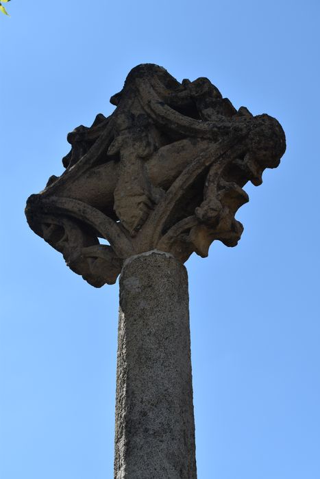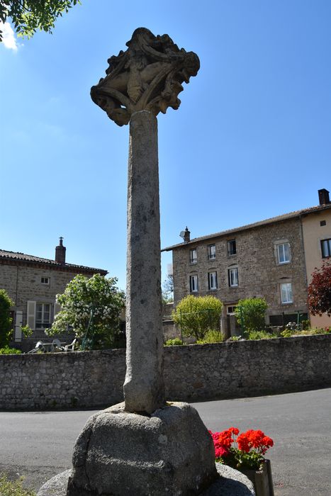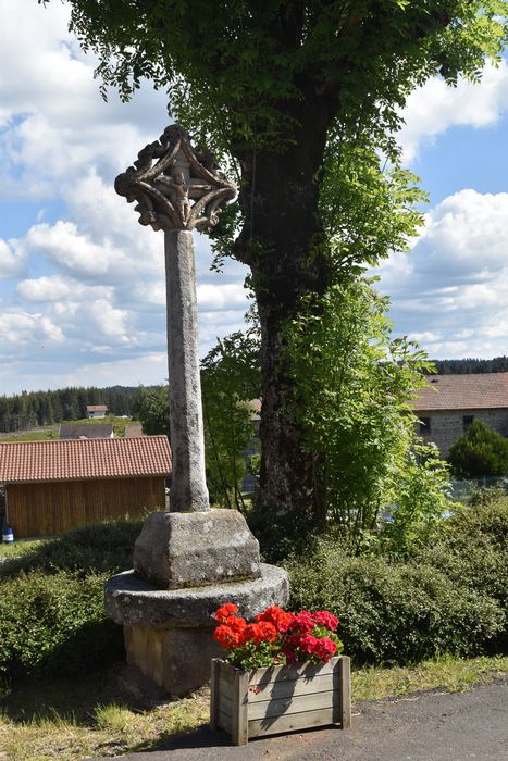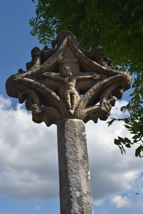 Ancienne croix de cimetière présentant deux branches cylindriques égales. Sur l'une des faces, un Christ cloué. Sur l'autre, une Vierge à l'Enfant. L'ornementation ajourée comporte des guirlandes de cordons nervurés formant encadrement autour des branches. Un collier métallique la fixe au sommet d'un fût élevé de forme octogonale dont la base carrée repose sur un socle massif trapézoïdal, carré à sa base.