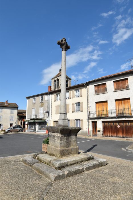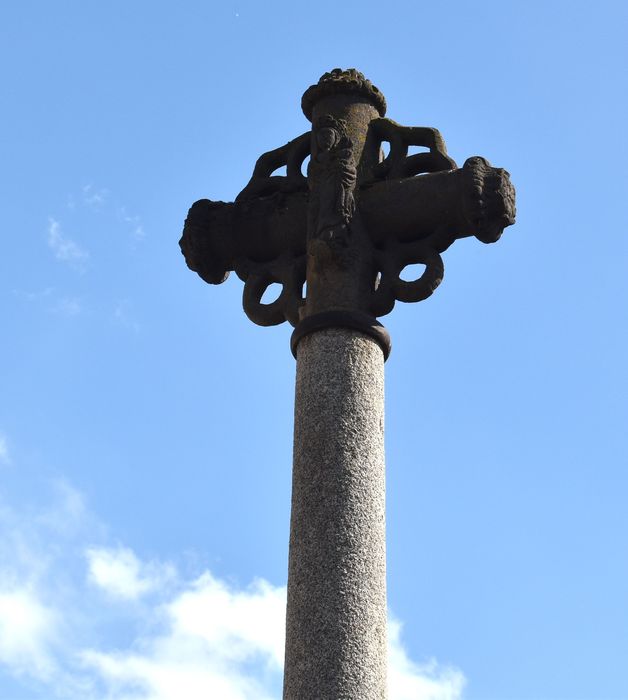 Croix de chemin en pierre, du début du 16e siècle, portant d'un côté le Christ, de l'autre la Vierge à l'Enfant. Les extrémités sont ornées de fleurons et les croisées forment une rosace.
