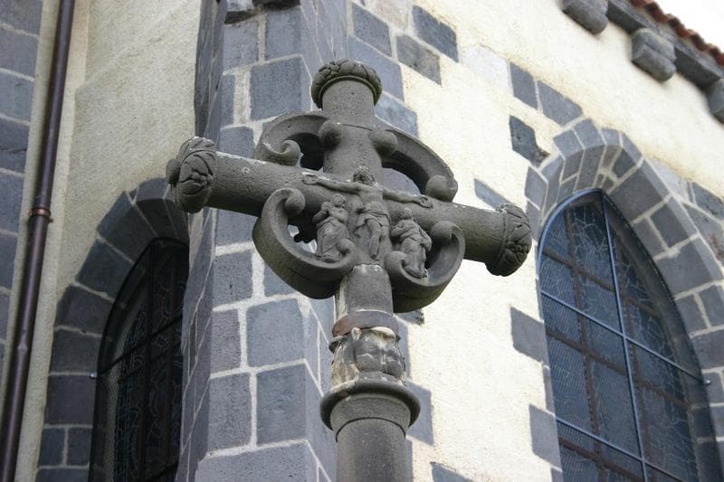 Croix du 16e siècle en lave de Volvic. Sur un piédestal octogonal et mouluré, part un fût cylindrique à la naissance duquel est un écu dont les armes ont été grattées. La croix posée sur ce fût, au-dessus d'une moulure, a ses quatre branches terminées par des feuillages et sont reliées entre elles par des volutes formant cercle autour d'un Christ au pied duquel sont la Vierge et Saint-Jean.