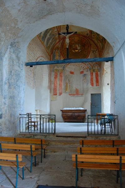 Ce modeste édifice d'origine romane, orné côté sud d'un portail gothique et coiffé d'un clocheton moderne, vaut essentiellement par l'ensemble des peintures murales qui a été découvert sur les murs du choeur : un cycle du 14e siècle, assez complet et bien conservé (Dieu en majesté, apôtre) et un cycle du 16e siècle (crucifixion).