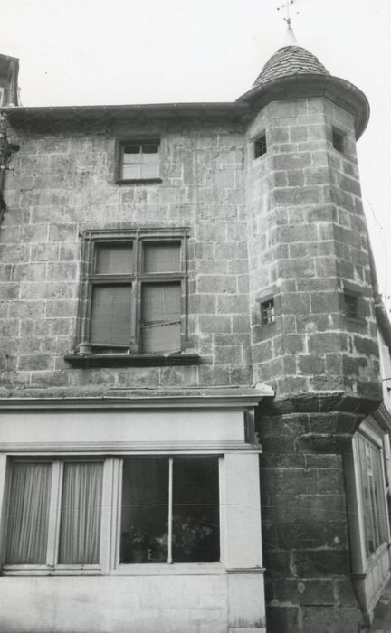 La façade sur rue de la Gendarmerie a seule conservé ses anciennes ouvertures, au-dessus du rez-de-chaussée. La fenêtre du premier étage a conservé sa croisée, son appui saillant et son encadrement mouluré d'un filet dégagé par des cavets. Les angles supérieurs sont arrondis et la moulure extérieure décrit une petite pointe d'accolade au centre du linteau. Au-dessus de chacun de ses angles est gravé un triangle où fait saillie un bouton. L'angle formé par les deux façades présente un cul-de-lampe polygonal supportant une échauguette polygonale. Deux de ses pans coupés sont percés, chacun, de deux petites fenêtres chanfreinées superposées. Cette échauguette se termine par une corniche abattue d'un cavet et est couverte par un toit en poivrière