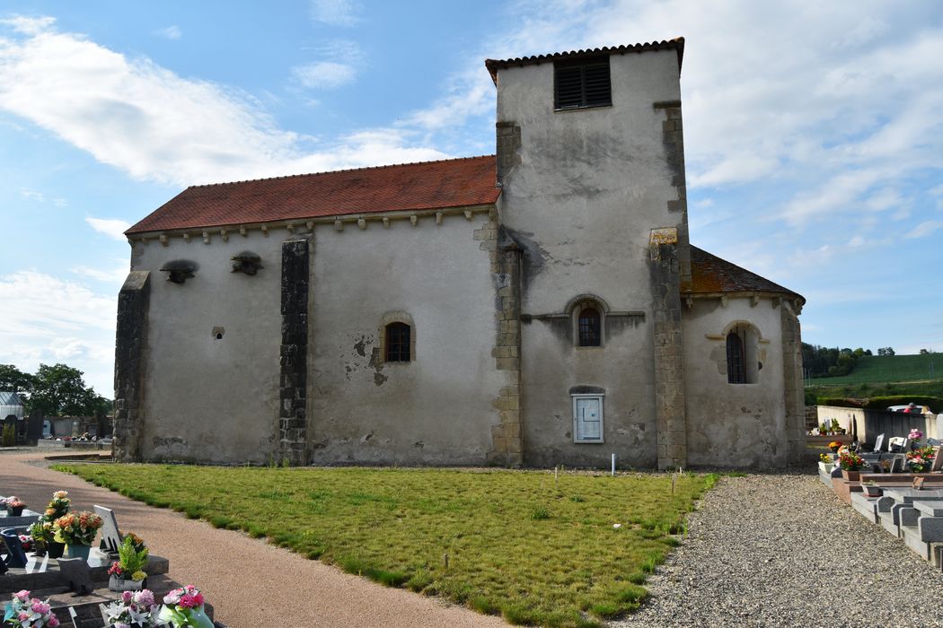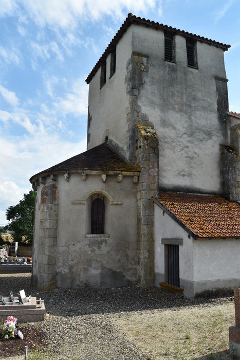 Eglise formée d'une nef de deux travées, d'un transept que surmonte le clocher, et d'un choeur en forme d'abside semi-circulaire. La voûte de la nef est fortement affaissée, accident devant remonter à l'époque de la construction. Il y a été remédié en établissant des sortes de cintres permanent en charpente qui servent aussi de tirants, fixés extérieurement par d'énormes clés en bois. L'abside est voûtée en cul-de-four et possède, sur son pourtour, un décor de cinq arcatures dont les colonnettes présentent des chapiteaux aux corbeilles sculptées de feuillages.